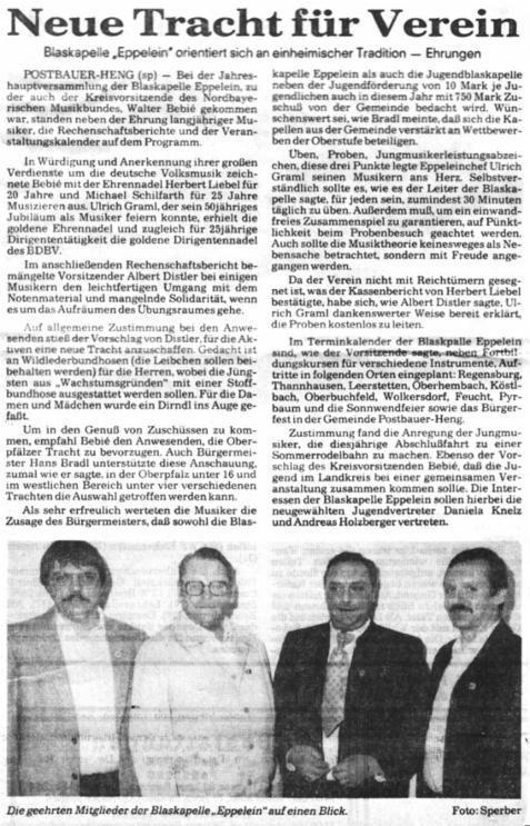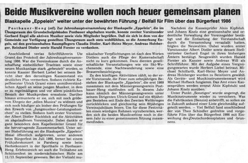 1987: Planungen für ein Fest zum 10jährige Bestehen der Blaskapelle Eppelein (mit dem Gesangverein Postbauer-Heng)