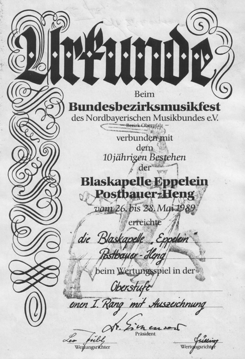 1989: "10 Jahre Blaskapelle Eppelein" und Bundesbezirksmusikfest in Postbauer-Heng